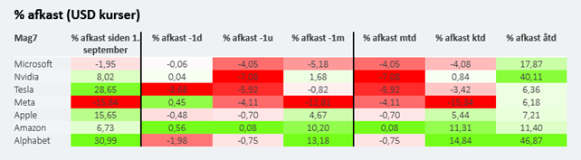Blandt ”Magnificent 7” teknologivirksomhederne er aktien faldet især for Meta (Facebook), men også Microsoft, Nvidia og Tesla har haft det svært. Alphabet (Google), Amazon og Apple har indtil videre holdt sig oven vande. Ser man på kursafkastet siden 1. september, er det især Meta-aktien, der er faldet.