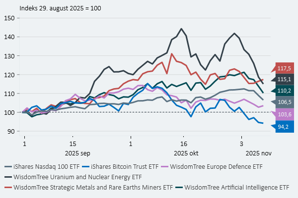 Blandt nogle af de populære aktietemaer har vi set korrektioner både inden for atomenergi, sjældne jordarter, AI-relaterede aktier, forsvarsaktier og kryptovalutaer så som Bitcoin og Ether. Der er også individuelle forklaringer på, hvorfor de her populære temaer er blevet ramt, men, at det rammer så bredt, tyder også på, at der er et element af gevinsthjemtagning.