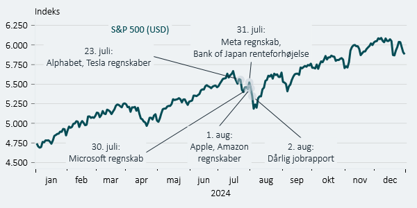 Den dårlige stemning minder om situationen i juli-august 2024. Dengang faldt aktier også i kølvandet på en ellers fin regnskabssæson, da forventningerne blandt investorerne var skyhøje. Ligesom nu faldt det sammen med svaghedstegn fra det amerikanske arbejdsmarked, hvilket forværrede investorernes risikoappetit. Sidste sommer overraskede Bank of Japan investorerne ved at sætte renten op.
