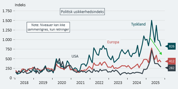 Det kan være svært at kvantificere, hvor høj den politiske usikkerhed reelt set er. Vi vil argumentere for, at den politiske sigtbarhed er blevet bedre, selvom den fortsat er højere, end hvad vi har været vant til de seneste år. Det argument synes understøttet af, at både økonomisk-politiske og handelspolitiske usikkerhedsindeks, der måler antallet af nyhedsartikler med specifikke usikkerhedsrelaterede ord, er på vej ned.