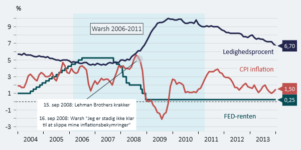 Der er flere citater at tage fat i, men ét af de mere kendte er fra FED-mødet dagen efter Lehman Brothers krakkede 15. september 2008, som accelererede de økonomiske og finansielle problemer. Dengang sagde Warsh, at “jeg er stadig ikke klar til at slippe mine inflationsbekymringer”. Det til trods for, at markedslikviditeten frøs, og den økonomiske nedtur blev forvirret. Inflationen kom aldrig, for efterspørgslen var for svag.