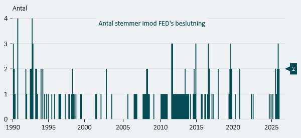 Det er derfor meget sandsynligt, at vi ender i en situation, hvor der er langt større uenighed i den pengepolitiske komité, inkl. at Warsh på pressemøder efter centralbankbeslutninger vil forklare, hvorfor FED har holdt renten i ro, men at han selv har stemt for rentenedsættelser.