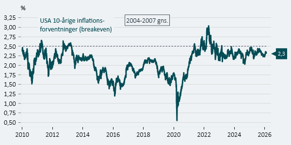 Jeg synes, det er svært at se, der skulle være sket et skred i FED’s troværdighed. Det er rigtigt, at langsigtede inflationsforventninger i markedet er steget med 0,30-0,50 %-point sammenlignet med perioden inden coronakrisen. Men det hører med til historien, at inflationen i 10’erne havde bidt sig fast på et lavere niveau end de 2 %. Inflationsforventningerne i dag er på niveau med midt-00’erne, faktisk er de lidt lavere, som på mange måder kan betragtes som mindre exceptionelt.